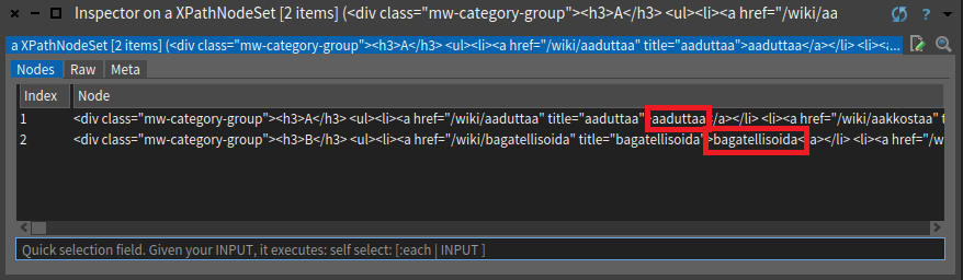 Lopulta haluamme ainoastaan <a> -elementtien tekstisisällöt: