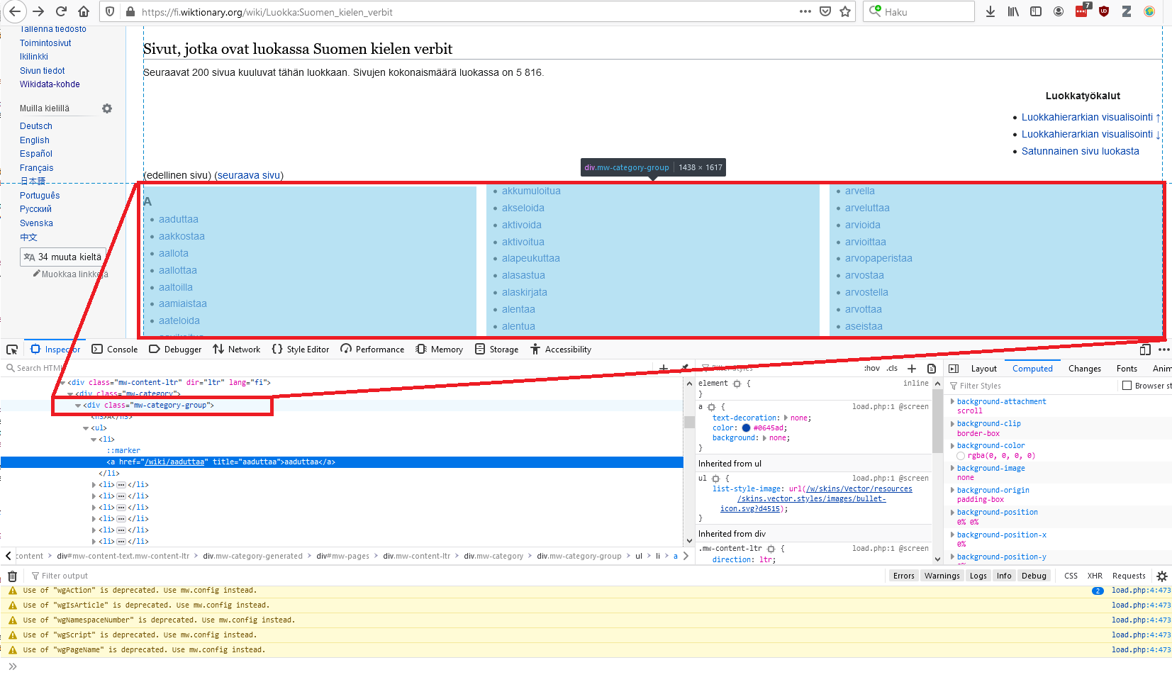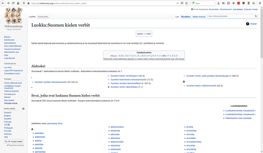 Kun hiiren vie hieman ylemmäs, "mw-category-group"-rivin päälle, huomaa, että kaikki verbit on korostettu sinisellä: