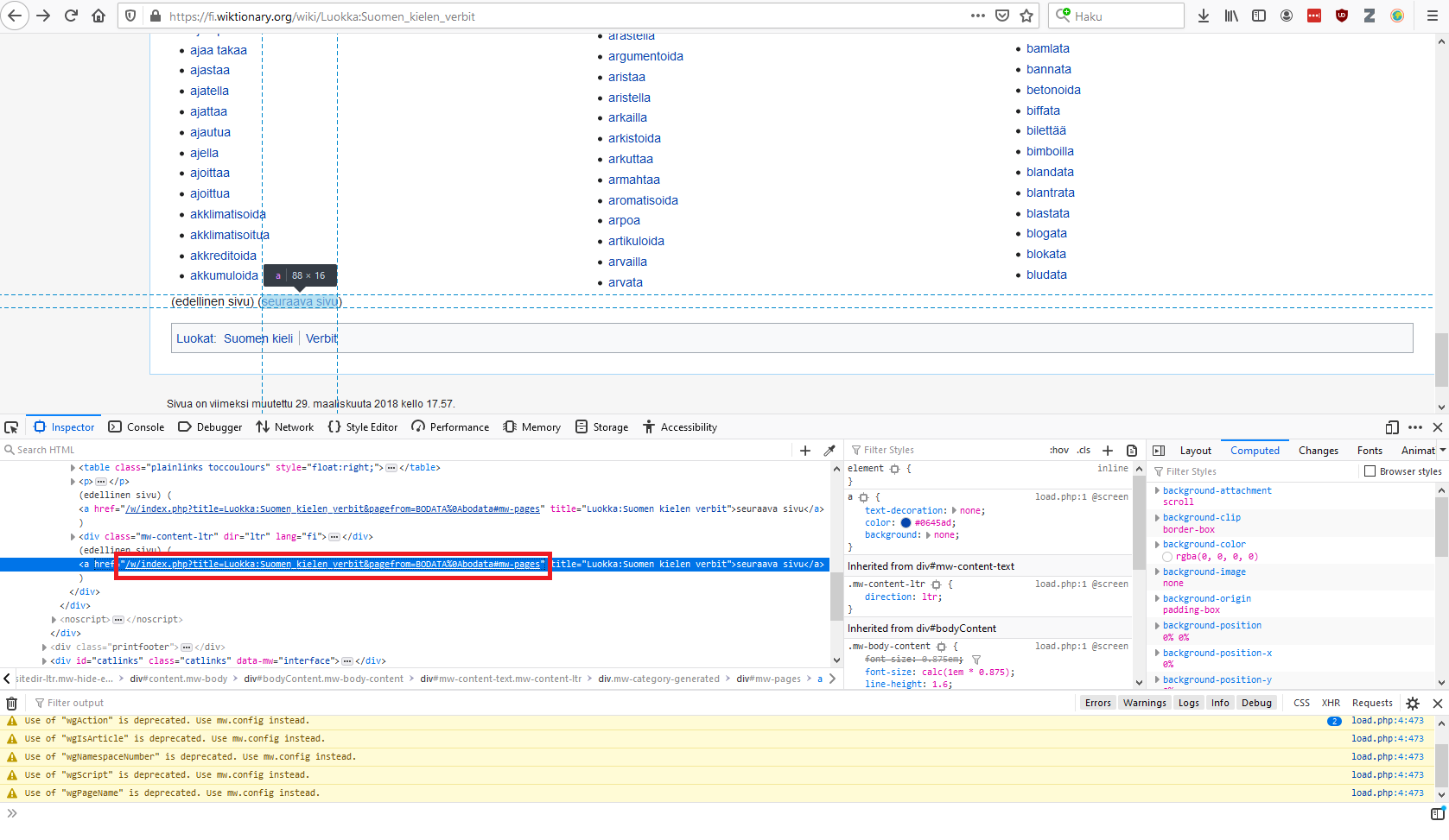 Jotta voidaan ladata seuraavan sivun lähdekoodi käsiteltäväksi, tulee tietää, missä linkki seuraavalle sivulle sijaitsee. "Seuraava sivu" -painike tulee verbien jälkeen. Tässä voi käyttää samaa "Inspect Element" -komentoa kuin aiemmin. Haluamme saada alla olevan kuvan merkatun href-attribuutin arvon tallennettua muuttujaan.