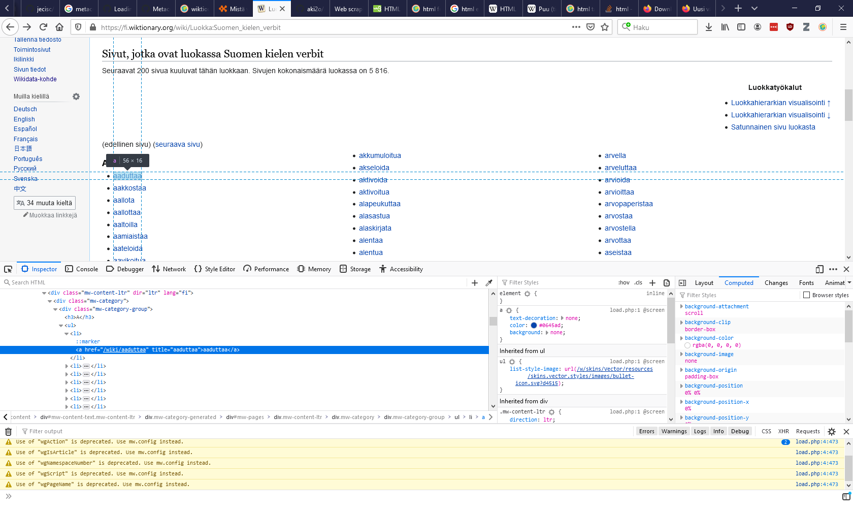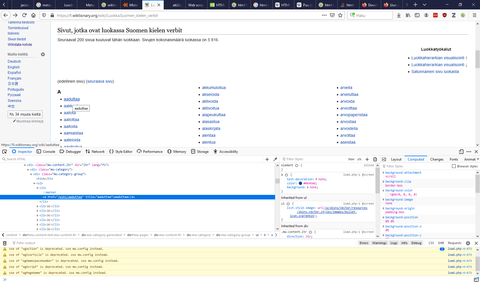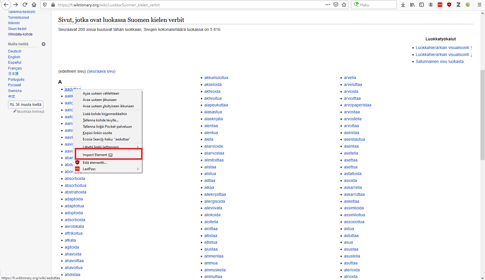 muuttujasta voi hakea tiettyjä elementtejä helpommin kuin pelkästä tekstistä hakiessa(Antaisiko tästä tarkemman esimerkin?). Tätä varten tarvitsee tietää, minkä elementin sisällä verbit ovat. Katsotaan nettisivulta, missä elementissä verbit sijaitsevat. Klikataan hiiren oikealla listan ensimmäistä verbiä (aaduttaa) ja valitaan vaihtoehto "Inspect Element (Q)".