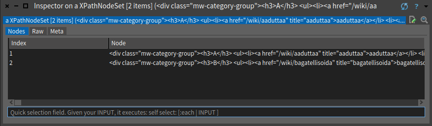 href-attribuutti sisältää ainoastaan linkin loppuosan, joten siihen täytyy lisätä linkin alkuosa "https://fi.wiktionary.org". Tämä tehdään komennolla "nextPageUrl := ('https://fi.wiktionary.org' , nextPagePath) asUrl."