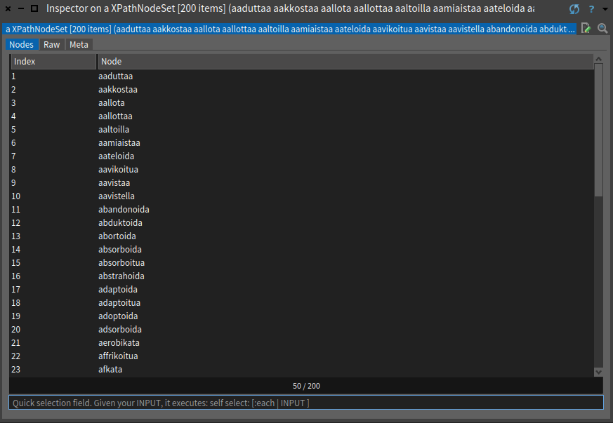 Nyt on saatu ensimmäisen sivun verbit tallennettua muuttujaan!